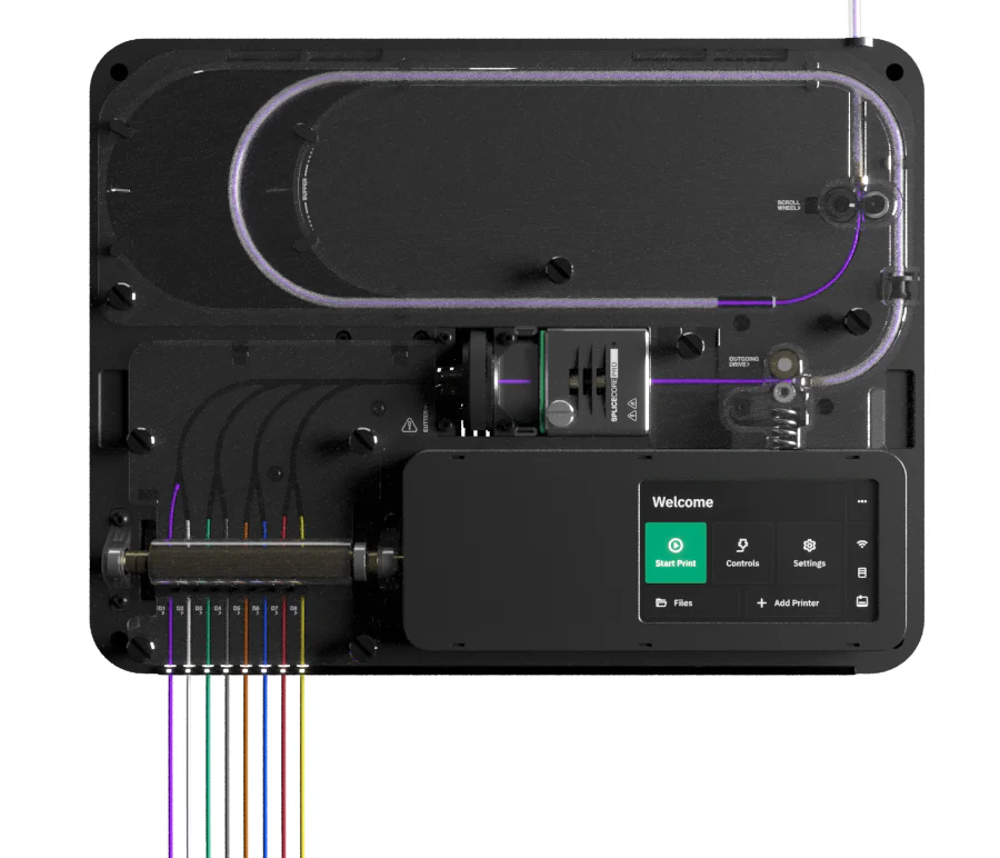 We’ve fine-tuned the algorithms to optimize the splice core tubes as well as increase splicing speed without any compromises in reliability and durability. This has been achieved by optimizing the inside of the splice core tubes to substantially reduce the chance of filament jamming inside the splice core. In addition, we’ve upgraded the cooling capabilities by incorporating an additional fan in order to cool filament as it exits the splice, increasing splicing efficiency, and making Palette 3 Pro 20% faster than Palette 2S and 10% faster than Palette 3.mosaic-palette-3-pro-simple-multi-material-3d-printingIntegrated Canvas Hub
